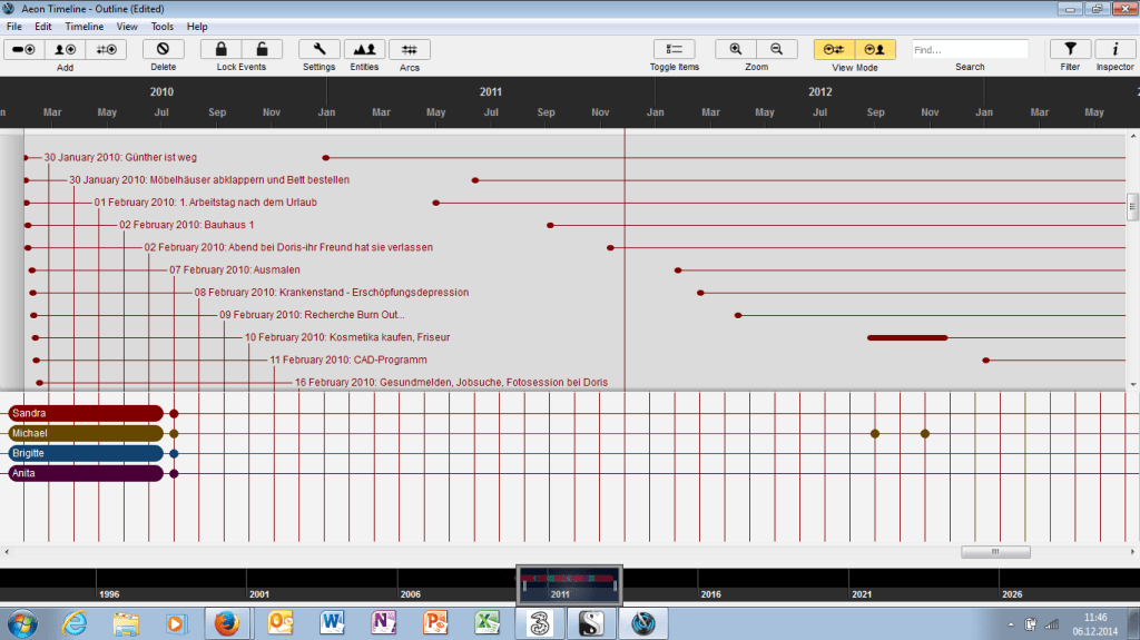Es ist ein Programm zum Erstellen von Zeitlinien -sei es für Projekte oder auch Romane. Wobei ich es für klassisches Projektmanagement nicht unbedingt einsetzen würde. Aber für Zeitlinien für Romane – auch, um Plotlöcher zu erkennen oder Logikfehler in der Abfolge ist es gut. Und um Handlungsstränge im Auge zu behalten.
